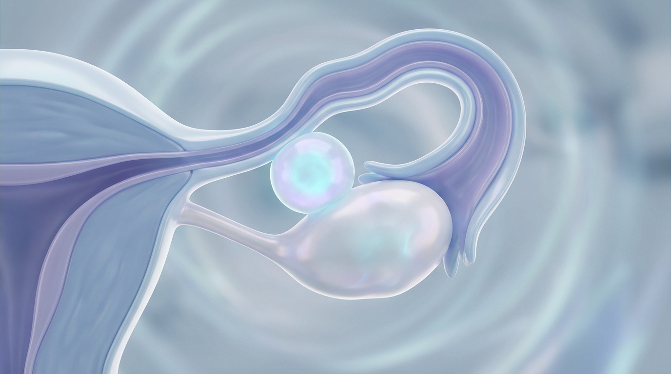 Illustration 3D détaillée des organes reproducteurs féminins avec un kyste sphérique visible près de la trompe de Fallope et de l'ovaire.